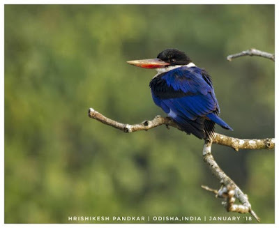'चिऊताई चिऊ ताई दार उघड...थांब माझ्या बाळाला अंघोळ घालू दे' इथं पासून ते या 'ब्लॅक कॅप्ड' किंगफिशर पर्यंतचा पक्षांसोबतचा प्रवास खऱ्या अर्थाने मजेशीर होता.गेल्या वर्षी गोव्या मधल्या 'झुआरी' नदीत याला सर्वप्रथम पहायची संधी मिळाली.पण कॅमेऱ्यासमोर बसण्याची त्याची इच्छा नसल्यामुळे कॅमेऱ्यात कैद करायचे स्वप्न काही काळ लांबणीवर पडले.मात्र मागच्या आठवड्यात भितरकनिकाच्या खारफुटी जंगलात याला मनसोक्त टिपण्याची संधी मिळाली.डोक्यावर असलेला गर्द काळा रंग आणि मानेवर असलेला शुभ्र पांढरा पट्टा त्यामुळे आपले वेगळेपण अधोरेखित करणारा किंगफिशर कुटुंबातील हा पक्षी.